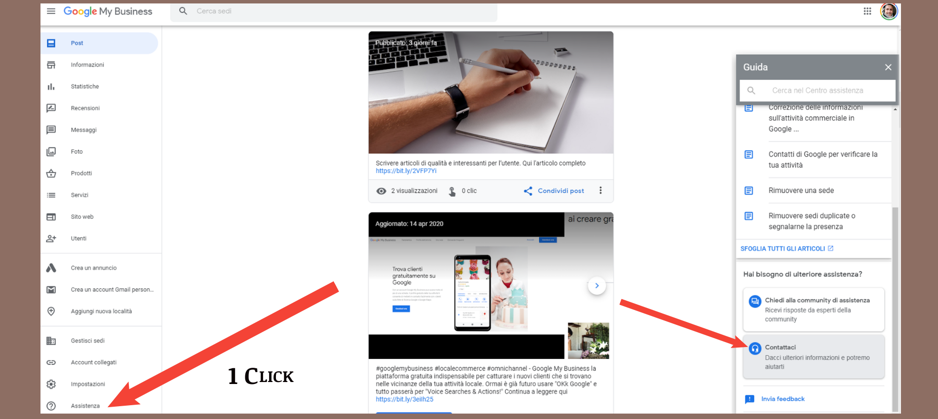 Nel caso tu abbia bisogno di contattare direttamente al telefono il team di Google My Business puoi farlo tranquillamente, non solo entrando da dispositivo mobile ma anche dalla versione Desktop. Vai sulla scheda My Business e cerca in fondo sulla sinistra il tasto "Assistenza", cliccando (1 passaggio) ti apparirà dal lato opposto: "Contattaci", entra e si apre un form da compilare: dai il segno di spunta su “Chiamami”, compila tutti i dati, compreso il cellulare e come dai "Invia"; dopo un po ti chiamano dall'assistenza Google My Business, provvedendo col il reparto tecnico a risolvere qualunque problema tu possa intercorrere. Vedi sotto una screenshot della mia area personale.